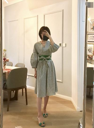 这条裙子真的超级适合绿油油的夏天,裙子整体的版型很显气质,小小的休闲感但却不失严谨,绿色条纹看上去也能让人觉得很亲和,封腰的设计应该是女孩们最喜欢的,在腰间打上一个漂亮的蝴蝶结,很有日式浴袍风的感觉,封腰是可以自由调节高度的,可以根据自己的身形去调节哦。