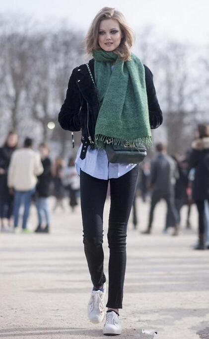 代表着生机活力与朝气的绿色,是大多数小仙女都不敢去挑战的。但是青草绿的围巾却是让人眼前一亮,时髦感爆棚!选择黑色短外套,内搭白色衬衫,简约又不失洋气。戴着青草绿的围巾更是锦上添花,搭配冬天的沉闷,迎来春天的希望!下装选择黑色小黑裤,脚上踩着小白鞋,洋溢着青春的味道,很有文艺范!