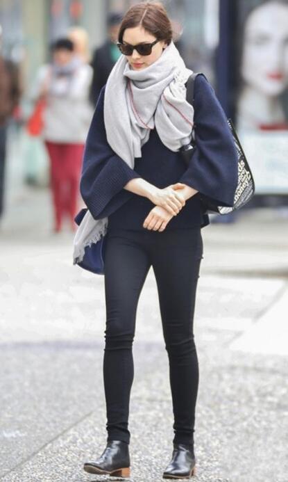很有质感的灰色围巾是时髦精的心头宝,满满的高级感啊!搭配深蓝色的大毛衣,慵懒中又有格调,简约又不失洋气!下装选择小黑裤,呈现修长纤细的美腿,脚上踩着黑色短靴,简约又不失时尚,有着淡淡的随性范!