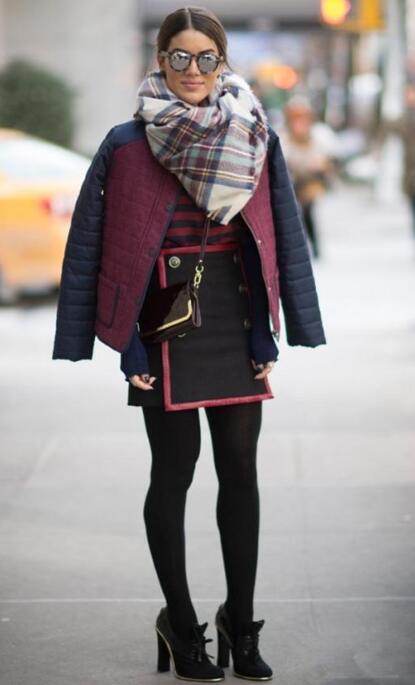 格纹是时尚界经久不衰的元素之一,无论是上装还是下装,随处可见格纹的身影,可见格纹的无限魅力!pick百变围巾,譬如这款格纹围巾,英伦风十足!搭配深蓝与酒红拼接的羽绒服,高贵又大气。搭配黑色短裙,看起来整个人娇小可人!性感的黑丝袜以及黑色小高跟,尽显女性曲线美。