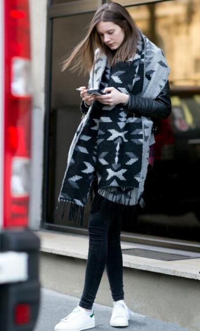 黑白灰三色组合的大围巾,披在肩头上,就好似披肩一样,打造优雅小女人,让你温暖过冬。搭配黑色牛仔裤,以及简约小白鞋,尽显恬静柔美的气质,回头率直线飙升!