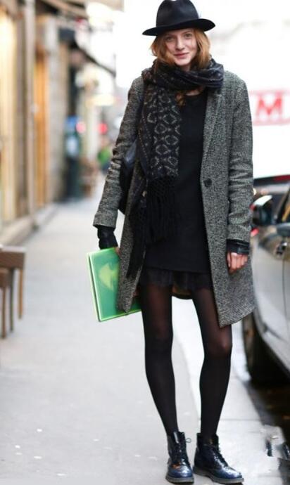 除了纯色的围巾, 那自然是少不了带有花色图案的围巾啦!选择深灰色的毛呢大衣,内搭黑色的连衣短裙,裙摆边缘的蕾丝元素,增添一丝女人的小性感,很是撩人!脖子上围着带有简单图案的黑色围巾,保暖的同时又增一丝活泼感,让你温暖过冬!黑色的薄丝袜以及黑色短靴,尽显优雅小女人味,十分迷人!