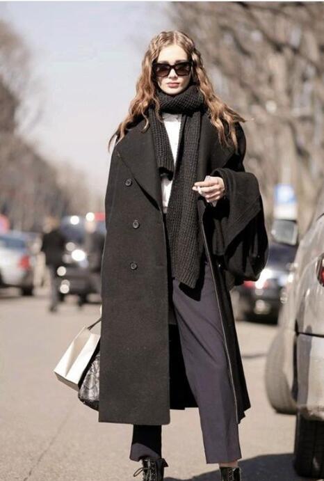 经典黑色是最百搭耐脏的,很有显瘦效果。冬天是穿大衣的季节,该是时候把往年的大衣拿出来晒晒咯!pick百变围巾,将黑色毛线围巾缠绕在脖颈上,保暖又大气。选择黑色的九分西裤,尽显知性优雅气质。同色系搭配,整体look协调。韩版的黑色大衣,显瘦的同时更添一丝干练!