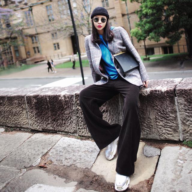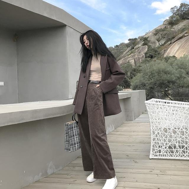 灯芯绒的面料能够给人一种温暖的感觉,再与温暖的咖啡色或是白色相配,这条阔腿裤给人的第一感觉就是温暖的舒适的。它的纹理很清晰,所以质感十足,不会软绵绵的贴在腿上,再配上一条黑色的腰带显得腰线更高。