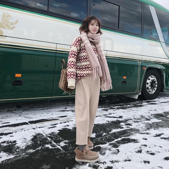 这是一款杏色的有点哈伦风格的阔腿裤,它的设计简约不挑身材,无论您是哪种体型都可以穿出瘦长的感觉。它用的面料比较好,穿起来宽又舒适。再搭配一件毛衣和一双雪地靴,既温暖又时尚。