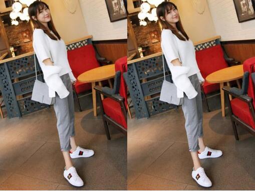 有了小白鞋,你穿衣的气质都得到提升,好看极了,很简单的白色T恤,袖子镂空的设计,瞬间提升了衣服的时髦度,好看多了,还可以修饰手臂线条的哦,下身搭配今期最流行的灰色休闲裤,造型舒适的同时,也十分减龄,但看起来还是稍微有点普通,如果再配上一双小白鞋的话,尽显小清新女生气质,无论你是上班,还是逛街约会,这都是你很不错的选择。