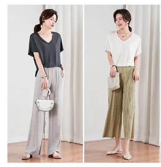 就是喜欢丝质阔腿裤的这种顺滑感觉和视觉上的高端大气上档次的感觉。有时它会有一些真丝面料独有的褶皱纹路看起来也挺不错的,因为我们全身已经有这么高端的一个单品,在搭配上选择一件最基础的纯色T恤就可以了,这样的搭配就会看起来特别年轻漂亮。
