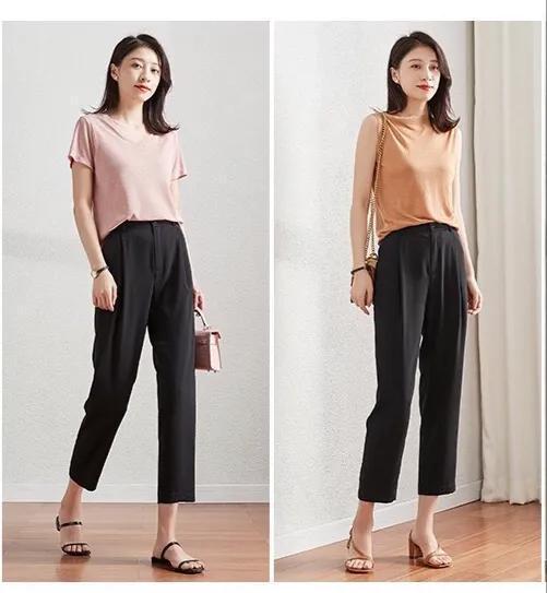 西裤里面我最喜欢萝卜裤,萝卜裤会腿比较细穿起来也特别舒服,搭配一件纯色T恤或者白色镂空花纹的衬衫或者小花纹的印花衬衫都是不错的选择,不仅显年轻而且让我们上班的时候也美美哒。