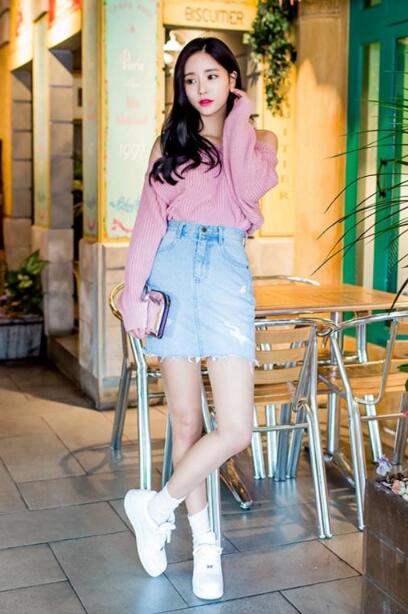 淡淡的粉色真是让人恨不得把所有的粉色都穿在身上,这款一字肩的粉色毛衣穿出了晚礼服的既视感,搭配一条牛仔裙,清新可爱,少女感爆棚。风度和温度,谁说不可以兼得?白色长袜的搭配也极具时尚感,整套搭配妥妥的仙女范。