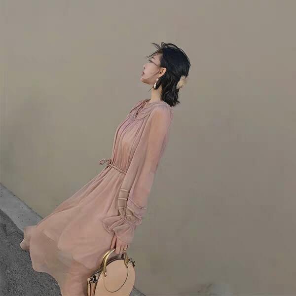 当柔和的色调搭配真丝的质感,什么是优雅与唯美相结合。这款简约而不简单的连衣裙能穿出属于仙女的婉约气韵,搭配系带,灯笼袖等设计给人一种浪漫的感觉,又增添了令人寻味的气质美,高调而不俗整体看上去更加复古唯美。淡淡的粉色加重了感性色彩,柔和中给人一丝温柔婉约,真丝有很好的透气感和垂感。另外,手工编织的腰带拉长了身体比例,给人很好的视觉感受。