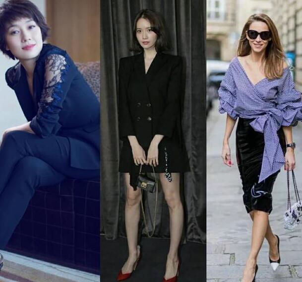 马伊琍西装上的蕾丝镂空元素,允儿的西服套装,还有V领绑带设计的衬衫,女装搭配,都是很高级的性感,还有下图中陈数穿的V领廓形白衬衫下其实配的是鱼尾裙,也是性感的元素,另外,想要性感,高跟鞋也是性感必备,尖头浅口高跟,效果最好。