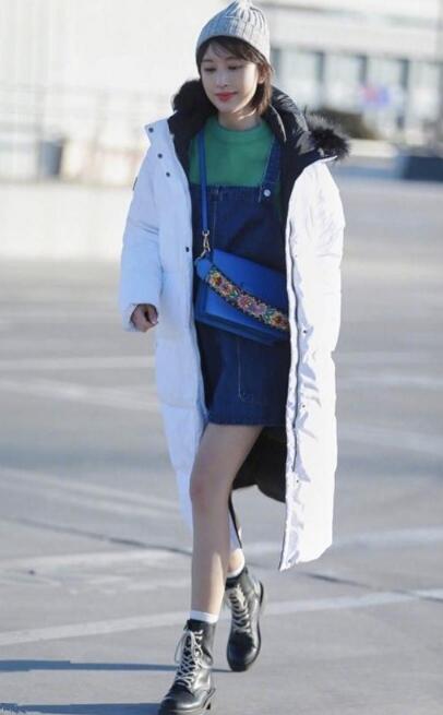 纯洁无瑕的白色,带给人一股清新脱俗的气息,很是撩人!冷到想要裹被子出门?get青草绿圆领毛衣,以及蓝色牛仔背带裙,尽显可爱少女心,让你逆龄成18岁的少女。外搭白色长款羽绒服,养眼又吸睛,时髦指数翻一番。脚上踩着黑色马丁靴,潮味十足。灰色的针织帽,起到点晴之笔的效果,更添一丝俏皮,元气满满!