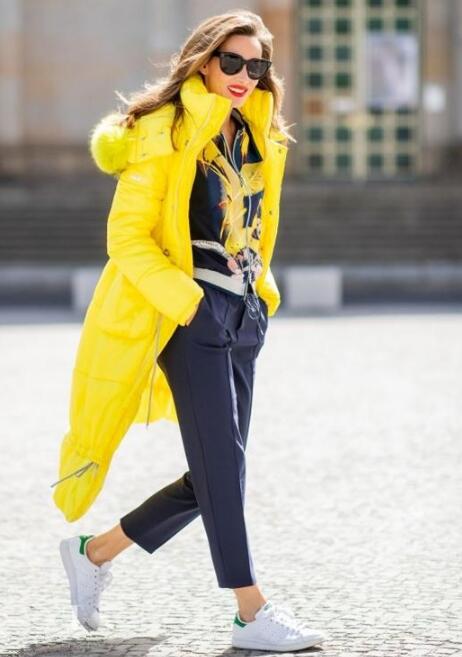 想要更出挑点,那亮眼的色彩为寒冬增添一道迷人的风景线,让人眼前一亮。让亮黄色长款羽绒服来拯救你,遇上灰色烟管裤,时髦指数翻一番,美得恰到好处。脚上踩着小白鞋,洋溢着青春与朝气,打造休闲文艺范,引人注目!