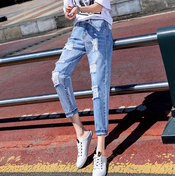 第二个要推荐的单品是浅色的破洞九分牛仔裤。一些比较年龄小一点的女生在夏天也是非常喜欢这种浅色破洞九分牛仔裤的,在搭配上非常的简单,随意的搭配一个纯色的T恤,效果都是比较不错的。