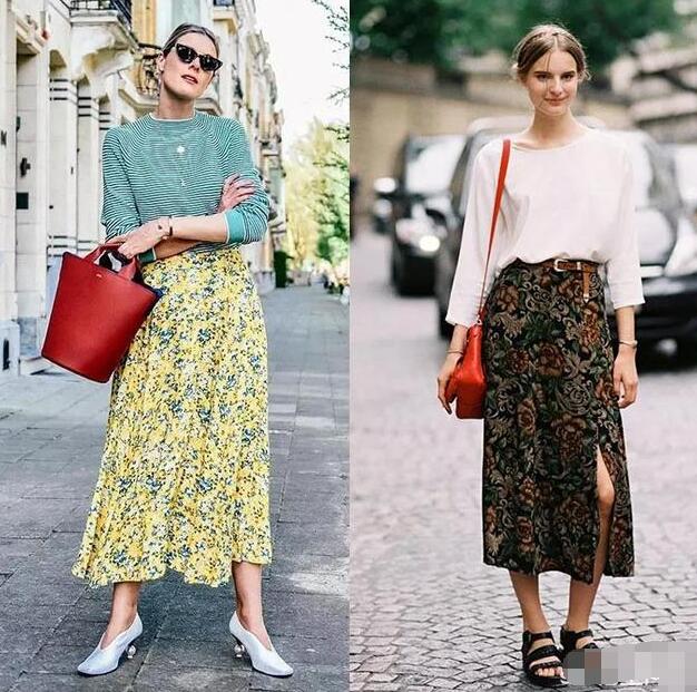 过膝的印花裙,自带一种优雅气质,搭配纯色的薄款毛衣,大方温柔,想要玩出一点新花样,则可以在印花上选择一点开叉设计,走路间露出腿部的线条感,超级迷人。