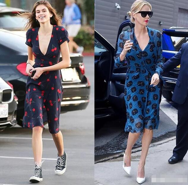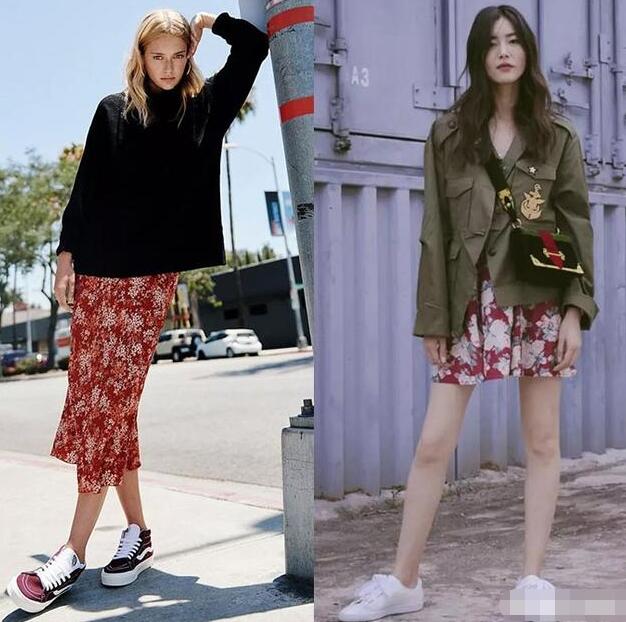 如果你拥有一双又长又直的大长腿,也可以像刘雯一样,选择膝盖以上的印花裙,比如红色印花裙,搭配绿色的小外套,脚踩一双小白鞋,清新大气,却不失时髦气质。