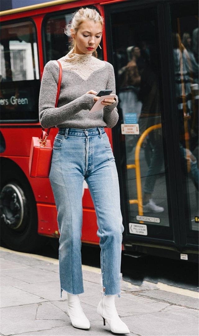 下图中的小直筒牛仔裤的大腿位置紧贴腿部曲线,显得又长又直,唯一不足之处就是容易暴露胯部以及大腿的缺点,所以梨形身材的女生不建议选择。用水洗蓝色的小直筒牛仔裤搭配蕾丝拼接款式的毛衣,把法式的优雅演绎到了极致。脚下搭配一双白色的皮质高跟鞋,时髦感倍增。
