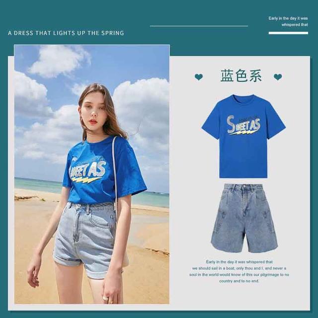 衣服的蓝色像是湖水一般,给人的感觉很清澈,但又像一个充满着故事的女人。短裤刚好被T恤遮住,多了几分迷人的小性感,双腿的轮廓也十分有型。
