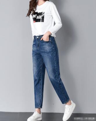 蓝色牛仔裤搭配白色T恤衫,然后下面再配上一双小白鞋,尽显青春的气息。把上衣扎进牛仔裤里面,会从视觉上提高腰线的位置,会显得腿比较长。牛仔裤是用的做旧的工艺,就像破洞的类型一样,都很受大众喜欢。