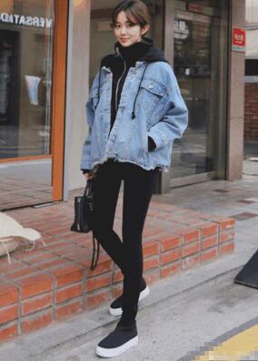 牛仔上衣,这是比较火爆的一款单品,里面还穿了一件黑色的卫衣,下面搭配的是一条修身的黑色铅笔裤,不过这种裤子只适合身材比较好的女生穿。蓝色牛仔和黑色紧身裤搭配在一起还是很好看的,不会显得太突兀。