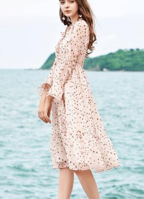 春天裙子自然是不可少的一件单品,每个女孩子都对裙子情有独钟,因为穿裙子看起来会很有魅力。这是一件碎花雪纺连衣裙,粉色的面料更加受女生喜欢。这种可以适合多种场景,不管是约会,逛街,还是工作,都很适合。