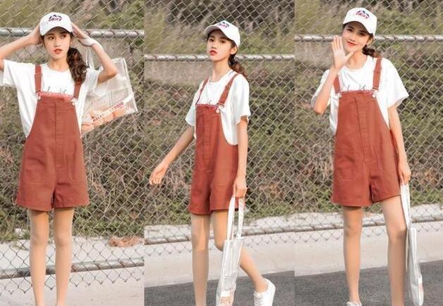 穿腻了黑白配,不妨来点不一样的吸引眼球吧,这款白色+棕色是不是更加吸引你呢?宽松的白色T恤,很是经典的款式,根本不挑人穿,穿上显瘦效果很强,外搭棕色的背带短裤,这样的穿搭是永远不过时的,看上去简洁但是不失时尚和活力。