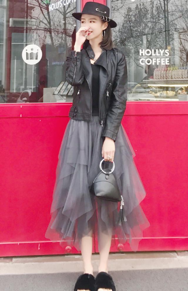 如果你喜欢比较淑女比较温柔的风格的话,也可以用皮衣来搭配连衣裙或者是半身裙,这样一来就算是酷酷的皮衣都能穿出温柔的感觉哦!