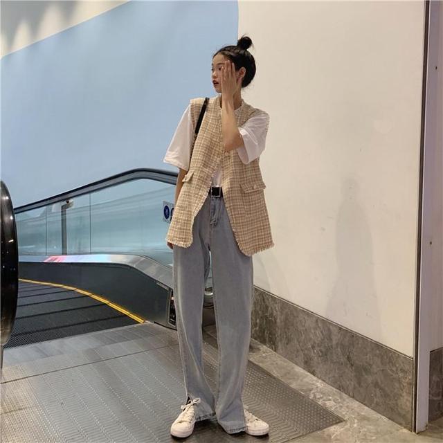 如果看腻了白T阔腿裤的搭配,不如试试再搭一件粗花呢的“小香风”马甲,它中和了牛仔裤硬朗,但又不会过分柔美,整体穿搭休闲又时髦。而且马甲还可以修饰溜肩窄肩等问题,能够在视觉上优化你的身材比例哦。