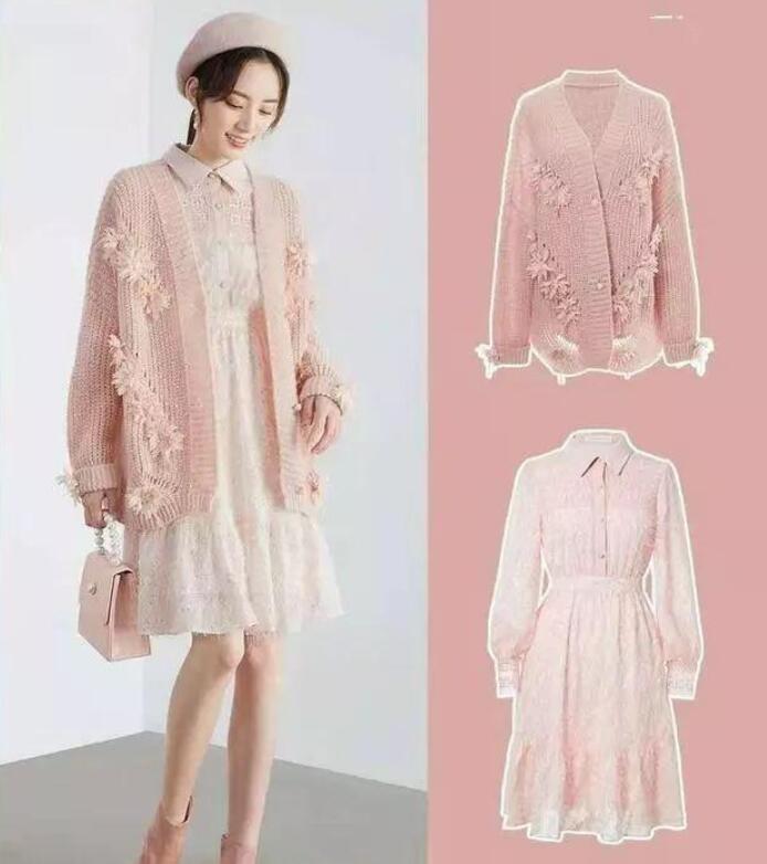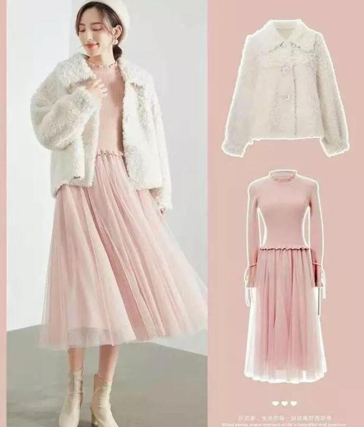尤其是浅粉的颜色,上半身针织的面料衬托出较好的身材,下身网纱又有点浪漫少女的感觉,外面搭配白色羊羔毛外套,温柔又保暖。加上白色贝雷帽与短靴,整身造型甜美少女气场中又不失女人味,男装搭配,超级迷人。