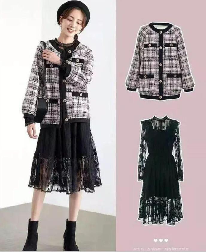 黑色蕾丝连衣裙,在细节加入的小透视设计,让整个女人气质多了一点点小性感,同时又一点也不会显的低俗,高腰收腰的款式最是显瘦显腿长,外套的小香风外套,将优雅加持,整体造型优雅又迷人。