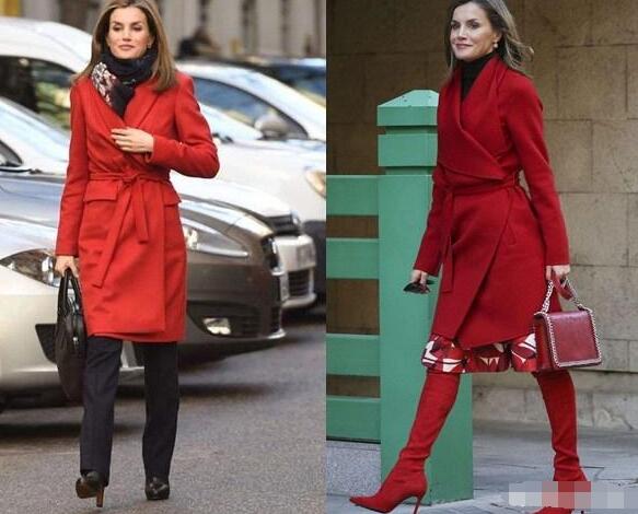 这几年很受瞩目的西班牙王后,莱蒂齐亚·奥尔蒂斯·罗卡索拉诺(Letizia Ortiz Rocasolano),她的衣品的确很高,在她身上常常会看到高阶的搭配手法,例如右边的这一套红色搭配,一点也不觉得刺眼,内搭黑色高领毛衣,下装搭配红色印花伞裙,红色浴袍大衣,红色过膝长靴,红色单肩包,王后很聪明地选择了伞裙的长度,在大衣以下10cm左右,刚好做了一个分割线,优雅,迷人。红色跟什么颜色搭配好看
