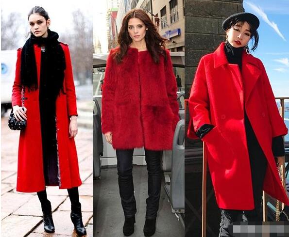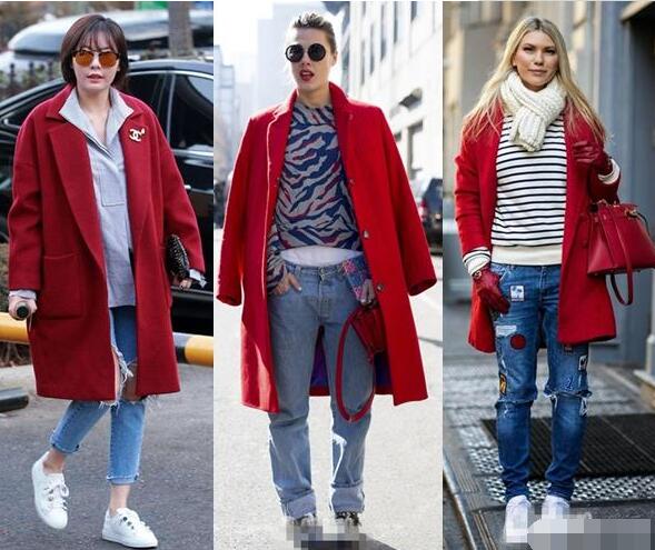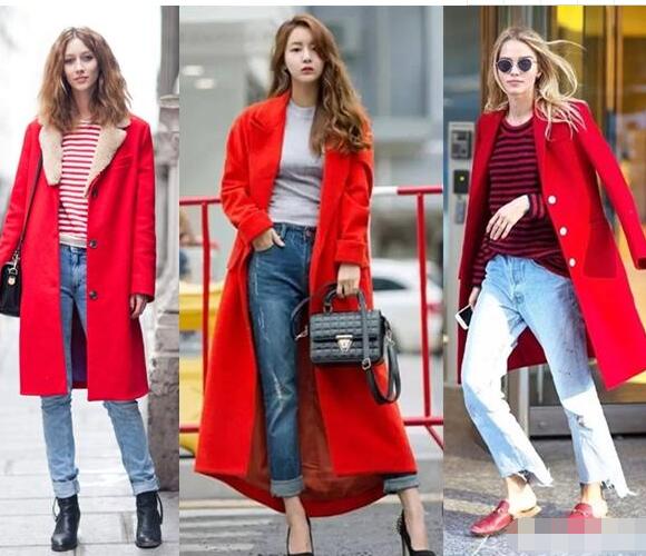 红色呢子大衣,内搭条纹T恤,显得很有活力,特别是条纹T也是红色的更加好看协调,下装搭配浅蓝色牛仔裤时髦耐看,如果脚上搭配毛毛款拖鞋更能时髦了,搭配黑色小短靴就实用性很强。如果你喜欢韩国御姐范,可以像中间的小姐姐一样搭配,内搭小圆领起那灰色打底衫,下装搭配蓝色卷边牛仔裤,尖头高跟单鞋,黑色高跟鞋与黑色小拎包相呼应,一头浪漫的大卷发,御姐范十足。