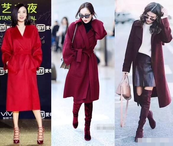 浴袍大衣可算是大衣当中,最有女人味的款式,修身的廓形,没有纽扣没有拉链,全靠中间的一根腰带支撑,把腰带系上非常闲身材,把腰带解开后背打随意系着,表示很洒脱的感觉,中长款的浴袍大衣可以像宋佳这样当连衣裙穿,衣服看上去款式简单,可是鞋子厉害呀,绑带鞋好性感。中间杨幂是比较保暖的穿法,内搭黑色高领毛衣,下装搭配酒红色半身裙,和丝绒面酒红色过膝长靴,酒红色,超级有女人味。你觉得宋佳还是杨幂的搭配时髦?