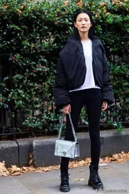 黑色马丁靴pick黑色裤子,十分有延伸性,显得腿特别修长,给你满分的帅气。 选一件深色外套,内搭白色单品,简约又舒服。外套的短款设计显得帅气十足。pick一个银色包包,十分优雅。