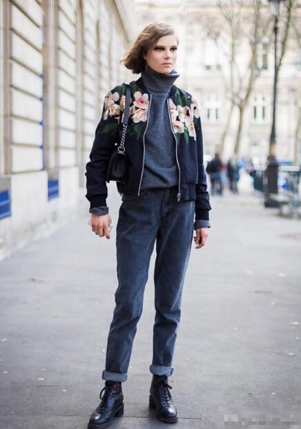 黑色马丁靴,低调帅气。搭配一条把裤脚卷起来的牛仔裤,马丁靴这样搭配,干练不拖沓。pick一个短款的外套,十分合适,保暖时髦又显气质。内搭一件高领毛衣,不仅时髦还保暖。毛衣和裤子同色搭配,简约柔美,极具时尚感。pcik一个黑色包包,简单又优雅,给你满分的帅气。