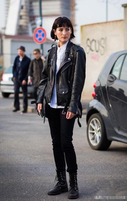 马丁靴搭配皮衣,帅得张扬。在黑色皮衣里内搭一件白色衬衫,十分简约,提高了整体的亮度。下装pcik一条黑色裤子,与马丁靴、皮衣的黑色相互呼应,十分有整体感,保暖时髦又显气质。