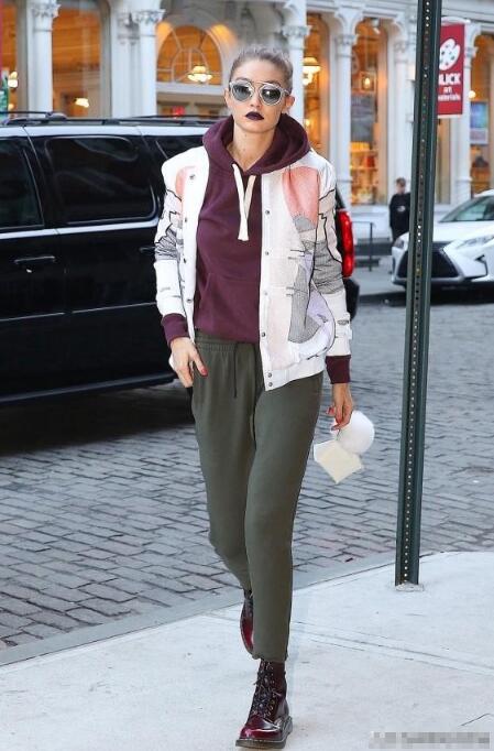 红色马丁靴,十分有魅力。上装pick一件短款外套,整个人十分高挑,保暖时髦又显气质。内搭一件深玫红色卫衣,毫不吝啬地彰显了活泼感。这个穿搭中,短款外套起了很大的作用,提高了整体的亮度,十分好看。