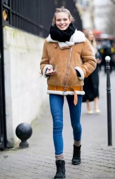 黑色马丁靴,十分低调优雅。搭配一件短款大衣,马丁靴这样搭配,简单又帅气。这款大衣的大部分面积是棕色,领口、袖口、衣服下摆加入白色毛绒,使整个搭配更时髦。Pick一条牛仔裤,凸显了修长的腿。脖子上get一条黑色围巾,小仙女想多保暖就有多保暖。