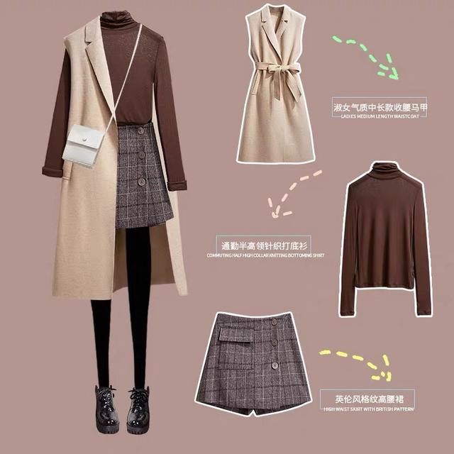 大部分的人在买马甲的时候,都会选择一些短款的,或是宽松的设计,其实这种长款的收腰马甲穿在身上也是特别的好看。马甲的长度较长,配上格纹的a字半身短裙,一双黑色的马丁靴,整套穿搭看起来英伦风十足。