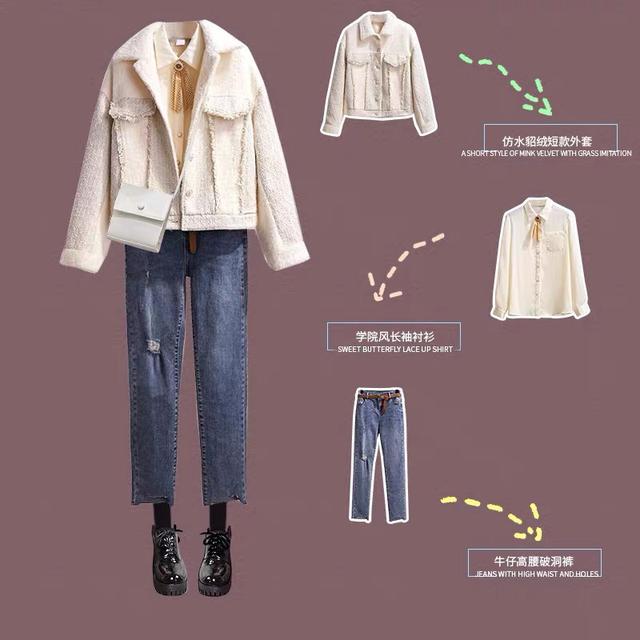 防水貂绒短款外套就特别的减龄又甜美了,外套的长度比较短,穿上身之后会显得你的腿很长。这个时候就要抓住优势,能够让身材被修饰得更加好看,一条深蓝色的牛仔高腰破洞裤就是特别好的选择了。这一套穿搭比较的偏青春学院风,格外的青春有活力。
