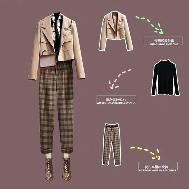 有的人喜欢穿长外套,因为更凸显气质,而有的人则喜欢穿短外套,尤其是小个子的女人穿上一件短外套之后,会让你的身高比例拉长不止一点点。米色的短毛呢外套,配上高腰的格纹长裤就能够让你看起来仿佛胸部以下都是大长腿,格外的显高又显瘦。这一件外套还略微带一点港风,特别适合一些小个子的女人。