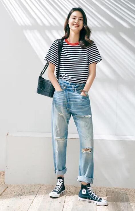 我想破洞牛仔裤也有很多喜欢中性风的女生喜欢,它帅气酷酷的感觉还有一点点痞痞的坏坏的感觉,搭配一件条纹T恤绝对亮眼。
