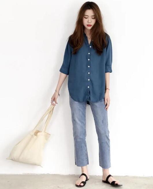 微喇牛仔裤有一种秀气小清新的感觉,挺适合甜美可爱的女孩子。像这样搭配一件纯色的休闲款衬衫就非常好看。