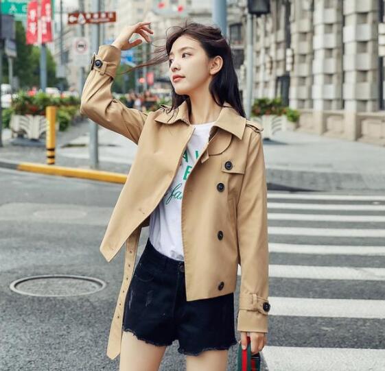 经典卡其色短款风衣,精美线条裁剪,贴身立体设计,现硬朗背影,帅气范儿十足,采用翻领设计,彰显饱满的精神面貌,短款的版型,即使是身高150cm的娇小女生也能轻松秀出逆天长腿视觉,搭配碎花裙,网纱裙,牛仔裤,帅气中带着甜美,更显时尚魅力。