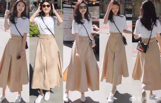 除了黑白灰,卡其色的出场频率算是最高的,卡其色非常百搭,也比较减龄,宽宽的腰带突出腰线,上衣搭配一件纯白T恤,轻松驾驭,十足小清新,在韩系搭配中白色与卡其色的搭配也是非常流行的,也很好驾驭。