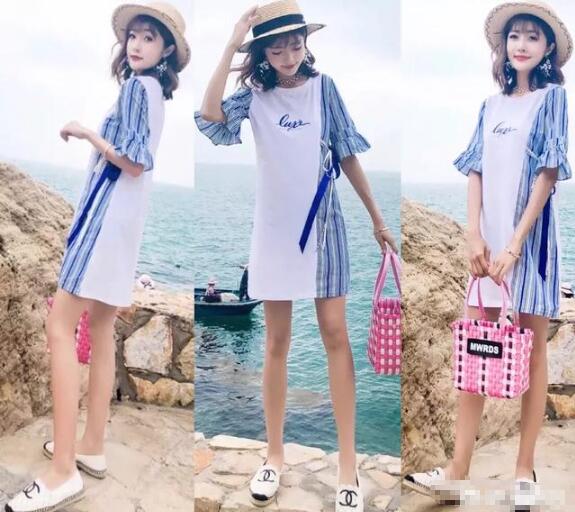 白色与蓝色条纹拼接,非常纯净的色彩搭配,袖口的荷叶边设计非常复古,裙摆的长度刚好遮住大腿三分之二,整条裙子还是非常显瘦的,再搭配一双小白鞋,女生小清新裙子款式推荐少女感十足,非常清凉的小清新气质。