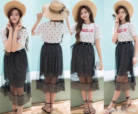 小清新气质应该是阳光中带点活泼俏皮,可爱中又带点恬静优雅,而柔美的网纱面料就能做到,黑色的波点网纱裙,搭配白色波点印花T恤,宛若花丛中的仙子,时尚甜美气质小清新。