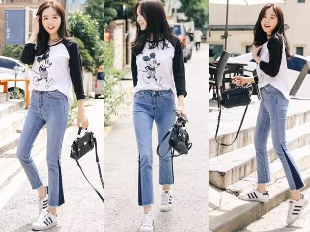 今年非常流行这种浅蓝色设计的牛仔裤,清新又时尚,并且还带着一种显白的效果,这款浅蓝色设计的喇叭牛仔裤,好看又不挑人,高腰+九分的裤长,无论谁穿起来都不会出错,显瘦又很美,裤脚拼接喇叭的设计,非常新颖独特,满满的时髦感,更好地修饰你的腿型,纤细又长,即便搭配小白鞋还是很显腿长的哦。