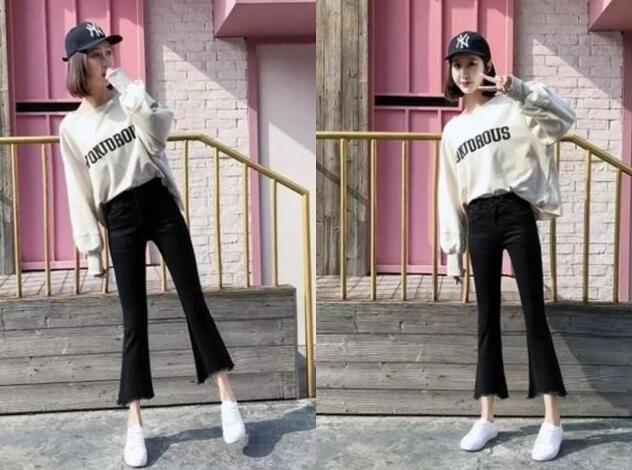 高腰+九分设计的黑色喇叭裤,轻松穿起来就很显高显腿长的了,不规则的裤口设计,更加时髦,而且长度也刚刚好,黑色又是显瘦的好搭手,对于多数身材的女生都很合适的,上衣半束腰搭配宽松T恤,整体造型给人显瘦的既视感,还有点潮的哦,配上纯色的小白鞋,简单又时尚。