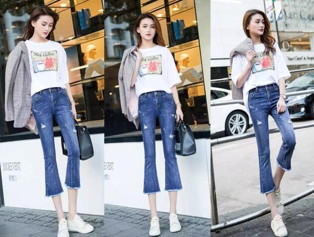2019年最显腿长的穿搭:喇叭裤+小白鞋,你们都穿上了吗?对于小个子的女生,这款七分设计的喇叭裤,再适合你不过了,随便一穿起来就可以打造出显高的效果,高腰+喇叭的裤型,更好地修饰你的腿部线条,看上去又瘦又很有线条感,美多了,融入了大热的破洞元素,瞬间增加造型的时髦感,非常地潮,上衣白T恤和格子西装外套,舒适又帅气,时髦感满分,脚踏小白鞋,无论怎么穿都显腿长,还炒鸡好看。